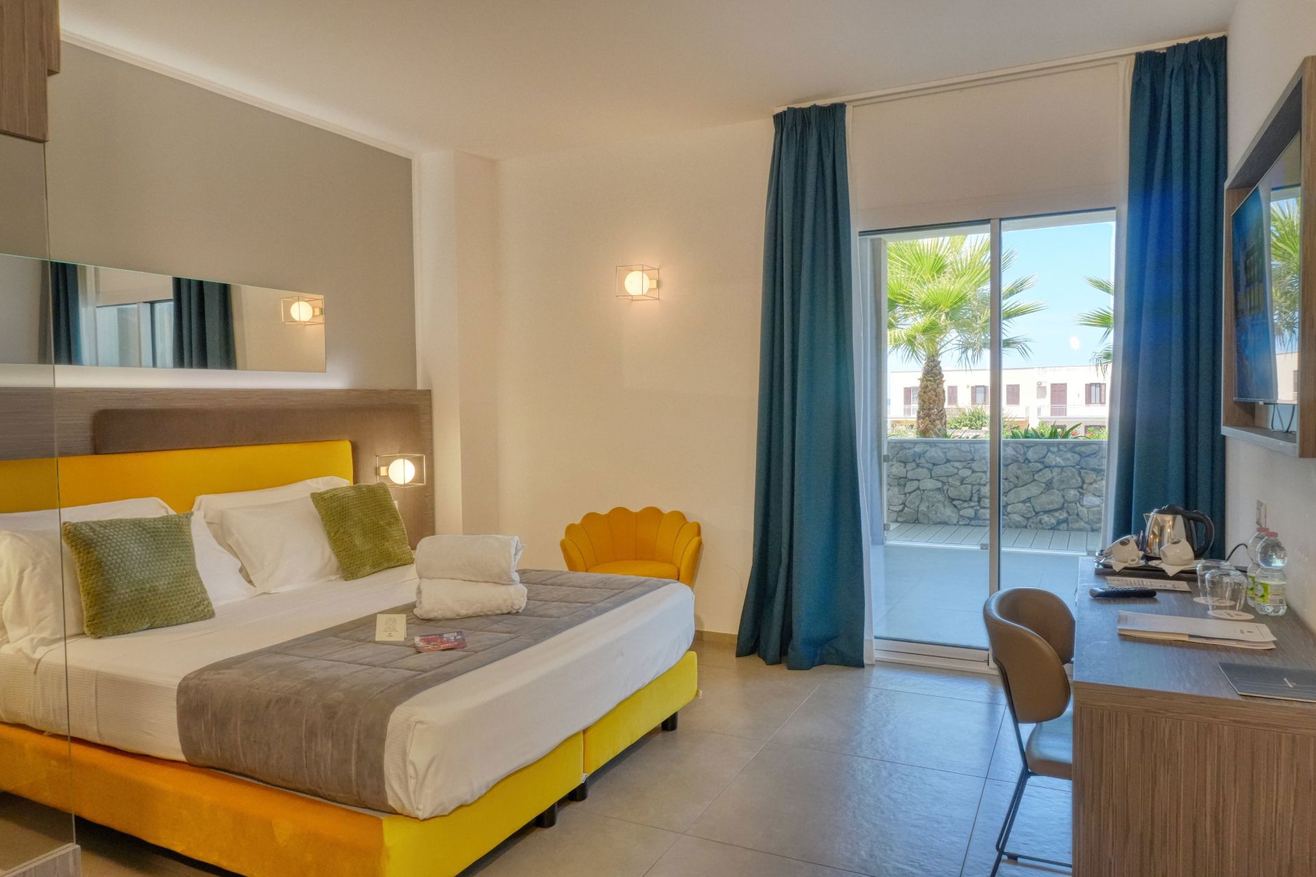 Alle Comfort Zimmer verfügen über eine entsprechend ausgestattete, kleine Terrasse mit Meerblick, einen Schlafbereich mit Doppelbett, Kleiderschrank, Stuhl und Schreibtisch sowie ein eigenes Bad mit Dusche, Föhn und Kosmetikset.
